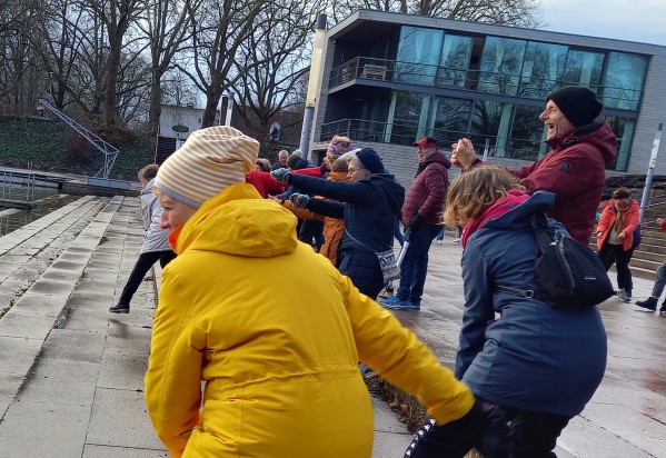 den Aaseeterrassen ins Jahr 2024 gestartet sind. Angeleitet wurde das Neujahrslachen